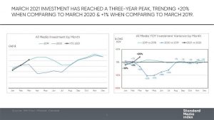 TV also had a very strong month, with an 11% increase in ad spending over March 2020 (which was down 10% over March 2019)