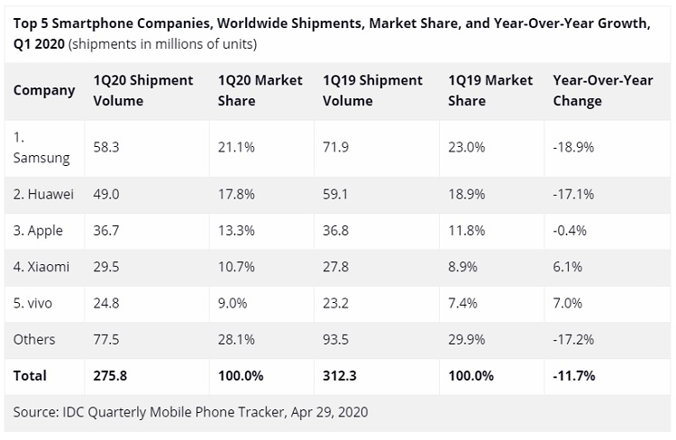 WORLDWIDE SMARTPHONE shipments decreased 11.7% year over year in the first quarter of 2020 — the market’s largest annual decline ever — according to preliminary data from International Data…